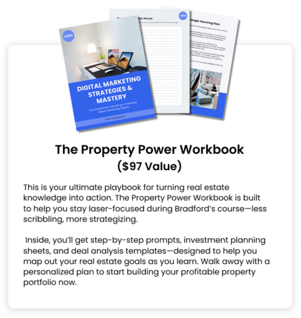 This is your ultimate playbook for turning real estate knowledge into action. The Property Power Workbook is built to help you stay laser-focused during Bradford’s course—less scribbling, more strategizing.