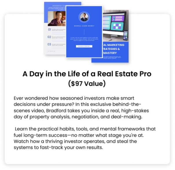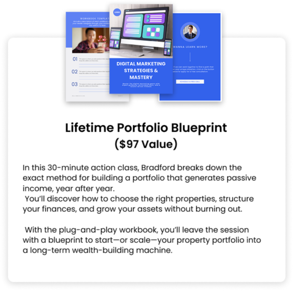In this 30-minute action class, Bradford breaks down the exact method for building a portfolio that generates passive income, year after year. You’ll discover how to choose the right properties, structure your finances, and grow your assets without burning out.